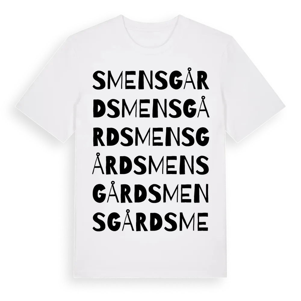 Smensgård ordlek t-shirt är inspirerad av Smensgård i Hallands län, Sverige. Tröjan är designad för dig som har en speciell koppling till platsen – oavsett om du bor här, har rötterna här eller bara älskar Smensgård.