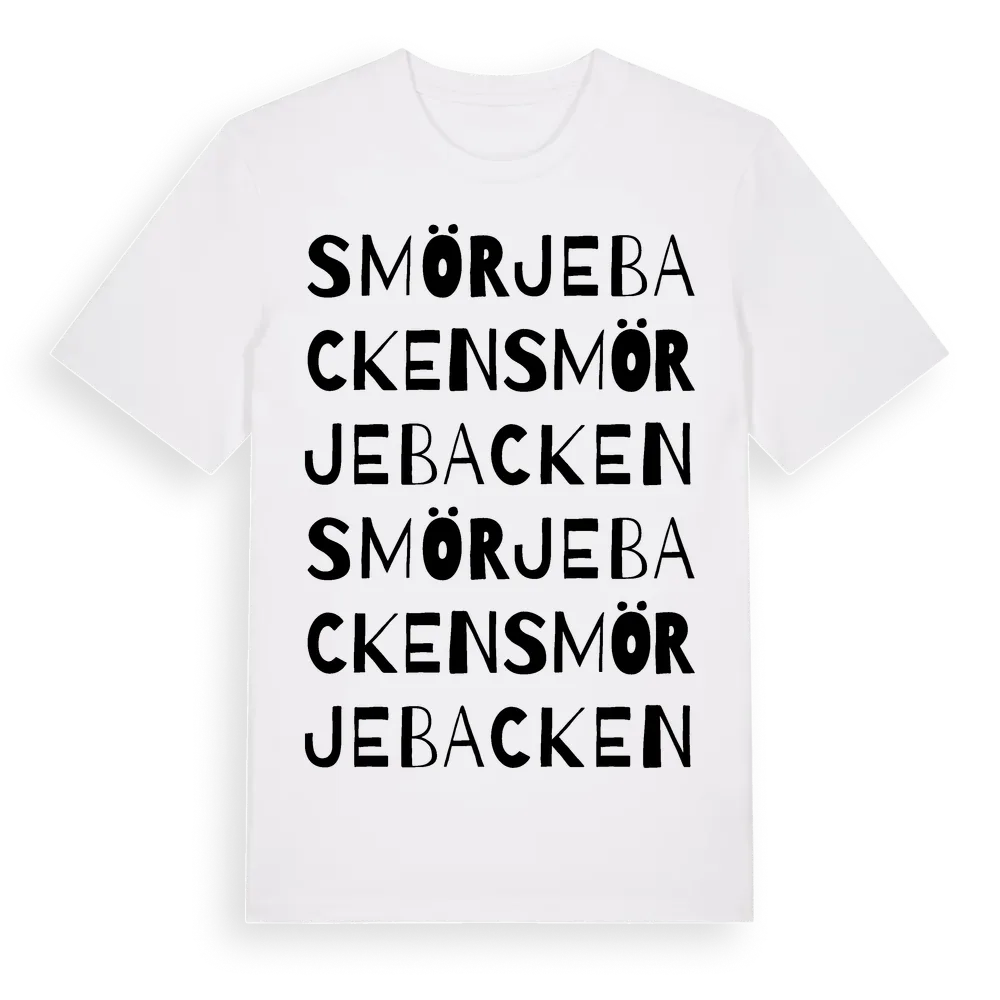 Smörjebacken ordlek t-shirt är inspirerad av Smörjebacken i Hallands län, Sverige. Tröjan är designad för dig som har en speciell koppling till platsen – oavsett om du bor här, har rötterna här eller bara älskar Smörjebacken.