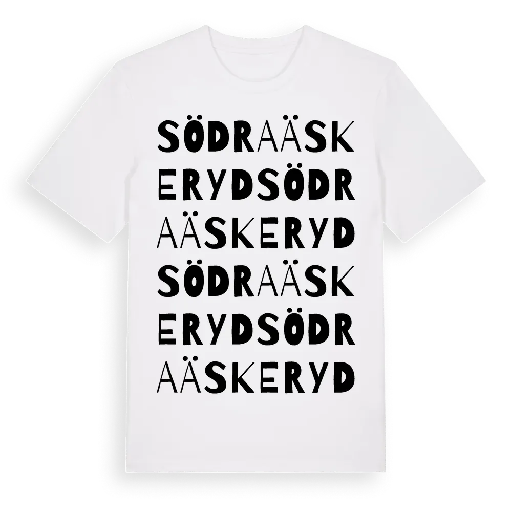 Södra Äskeryd ordlek t-shirt är inspirerad av byn Södra Äskeryd i Hallands län, Sverige. Tröjan är designad för dig som har en speciell koppling till platsen – oavsett om du bor här, har rötterna här eller bara älskar Södra Äskeryd.
