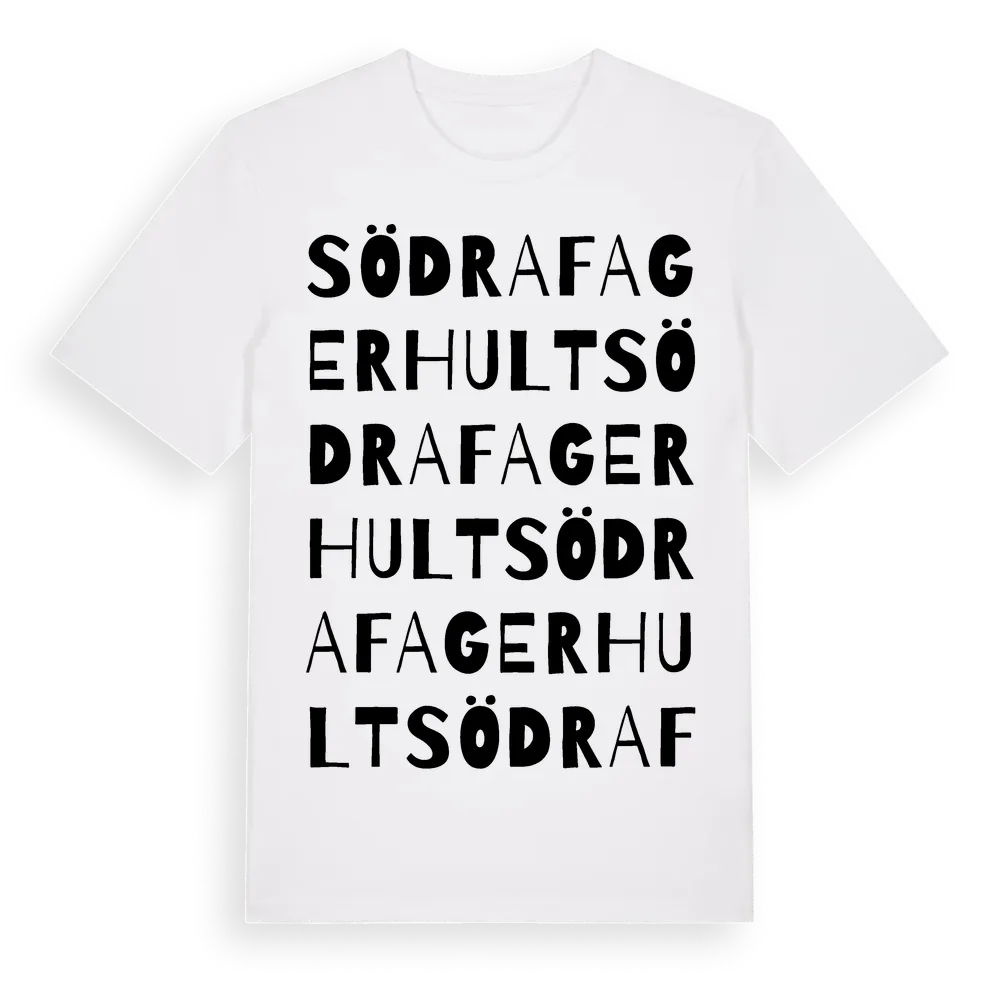Södra Fagerhult ordlek t-shirt är inspirerad av byn Södra Fagerhult i Hallands län, Sverige. Tröjan är designad för dig som har en speciell koppling till platsen – oavsett om du bor här, har rötterna här eller bara älskar Södra Fagerhult.