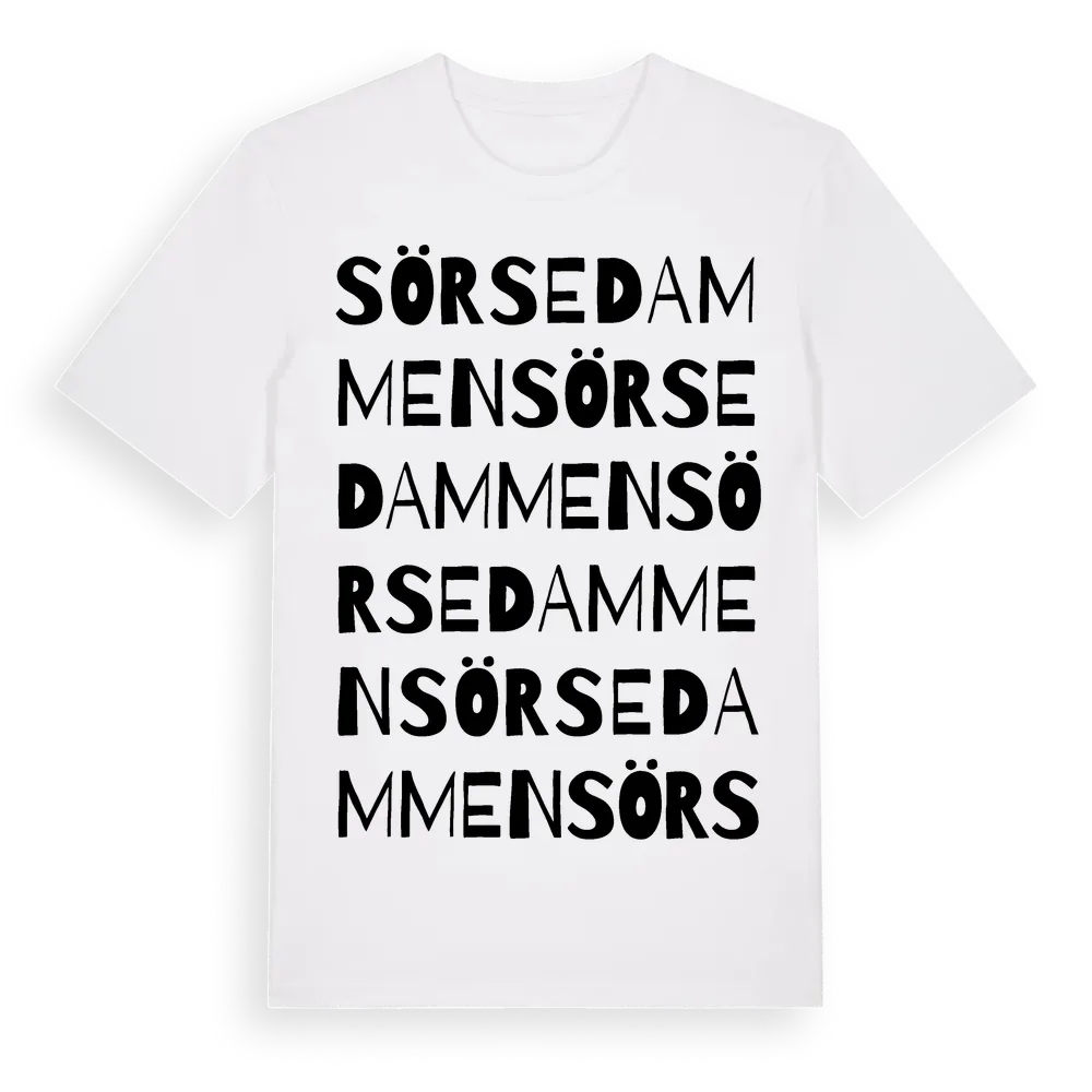 Sörsedammen ordlek t-shirt är inspirerad av stadsdelen Sörsedammen i Hallands län, Sverige. Tröjan är designad för dig som har en speciell koppling till platsen – oavsett om du bor här, har rötterna här eller bara älskar Sörsedammen.