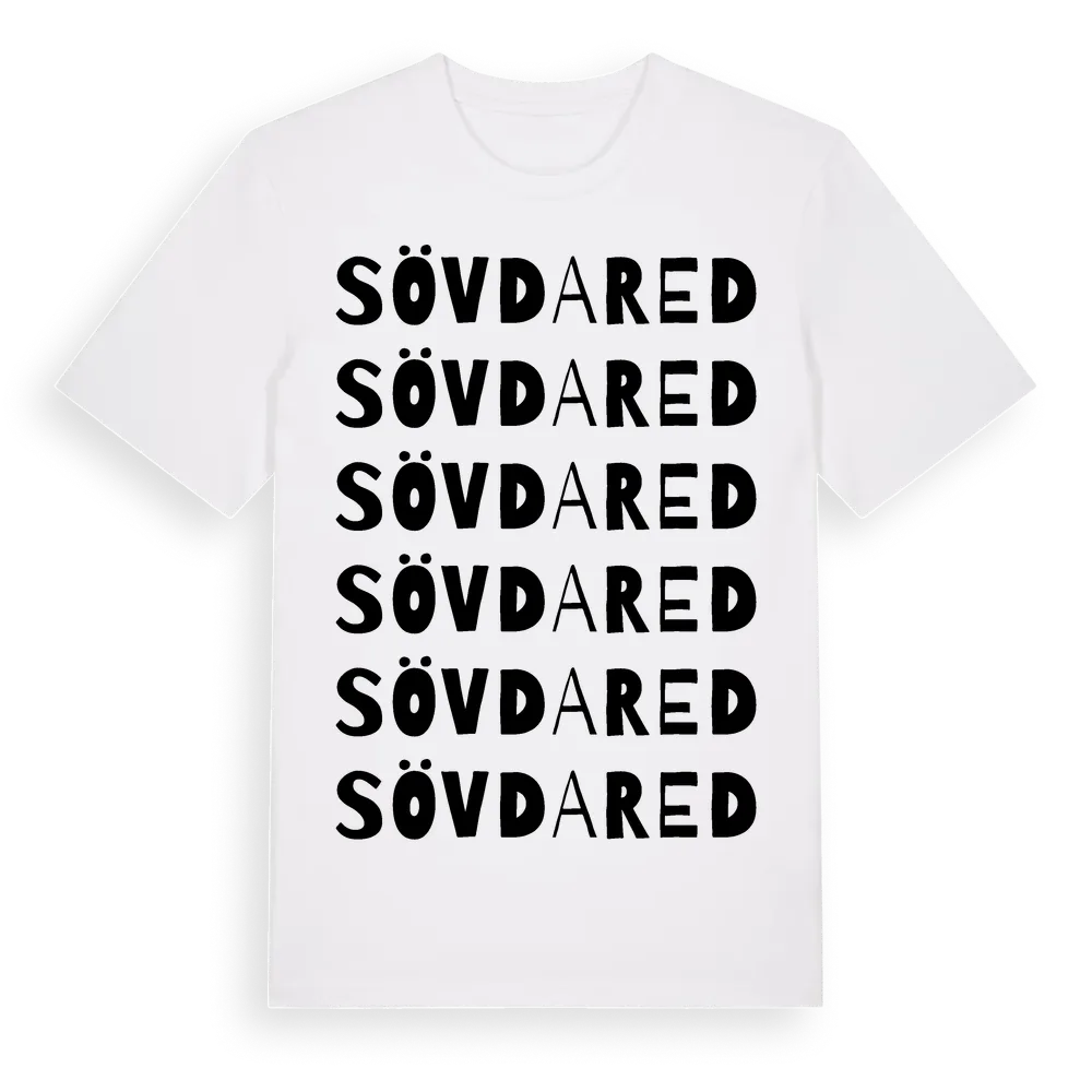 Sövdared ordlek t-shirt är inspirerad av byn Sövdared i Hallands län, Sverige. Tröjan är designad för dig som har en speciell koppling till platsen – oavsett om du bor här, har rötterna här eller bara älskar Sövdared.