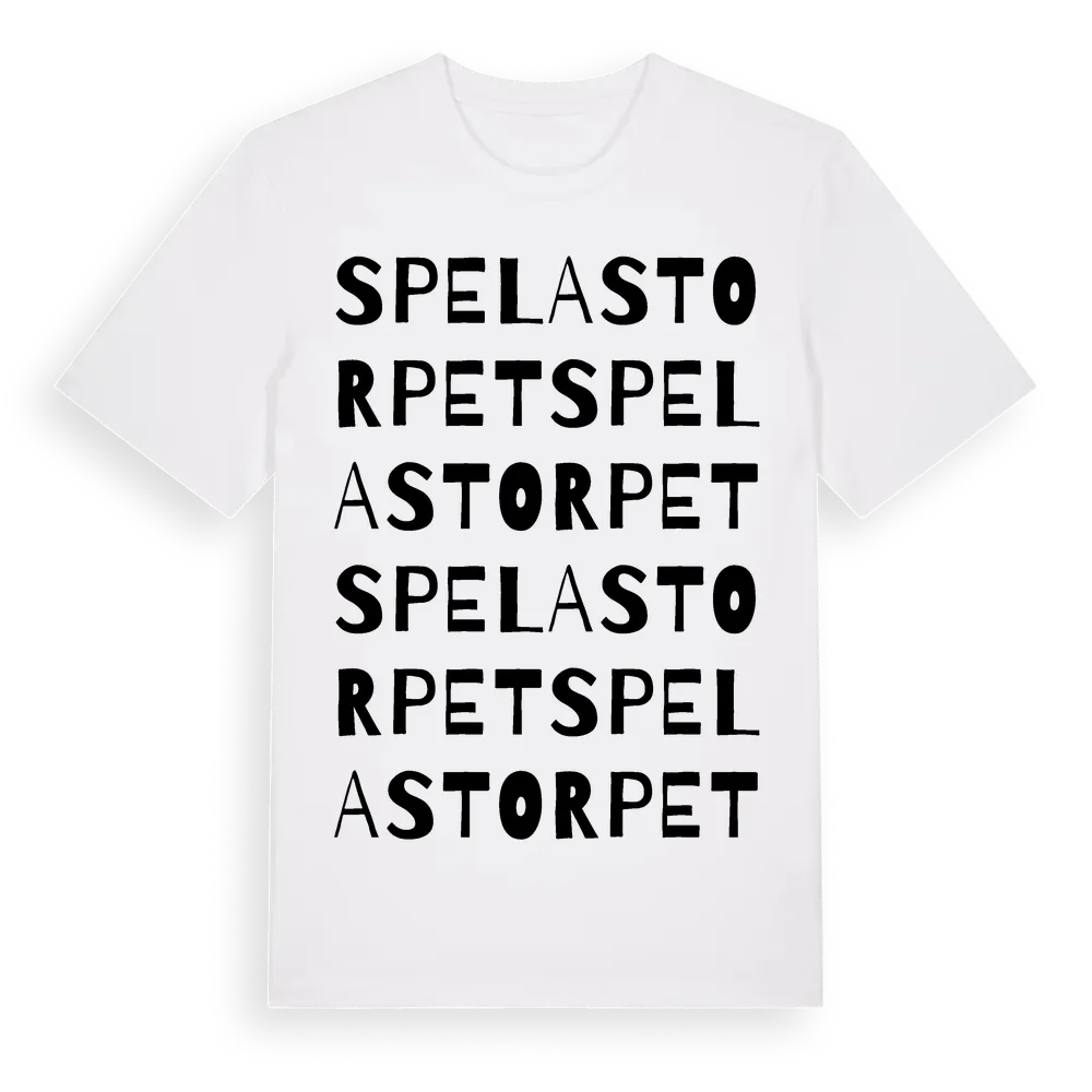 Spelastorpet ordlek t-shirt är inspirerad av Spelastorpet i Hallands län, Sverige. Tröjan är designad för dig som har en speciell koppling till platsen – oavsett om du bor här, har rötterna här eller bara älskar Spelastorpet.