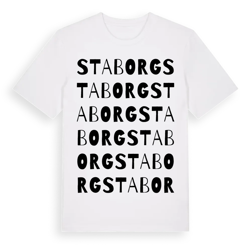Staborg ordlek t-shirt är inspirerad av Staborg i Hallands län, Sverige. Tröjan är designad för dig som har en speciell koppling till platsen – oavsett om du bor här, har rötterna här eller bara älskar Staborg.
