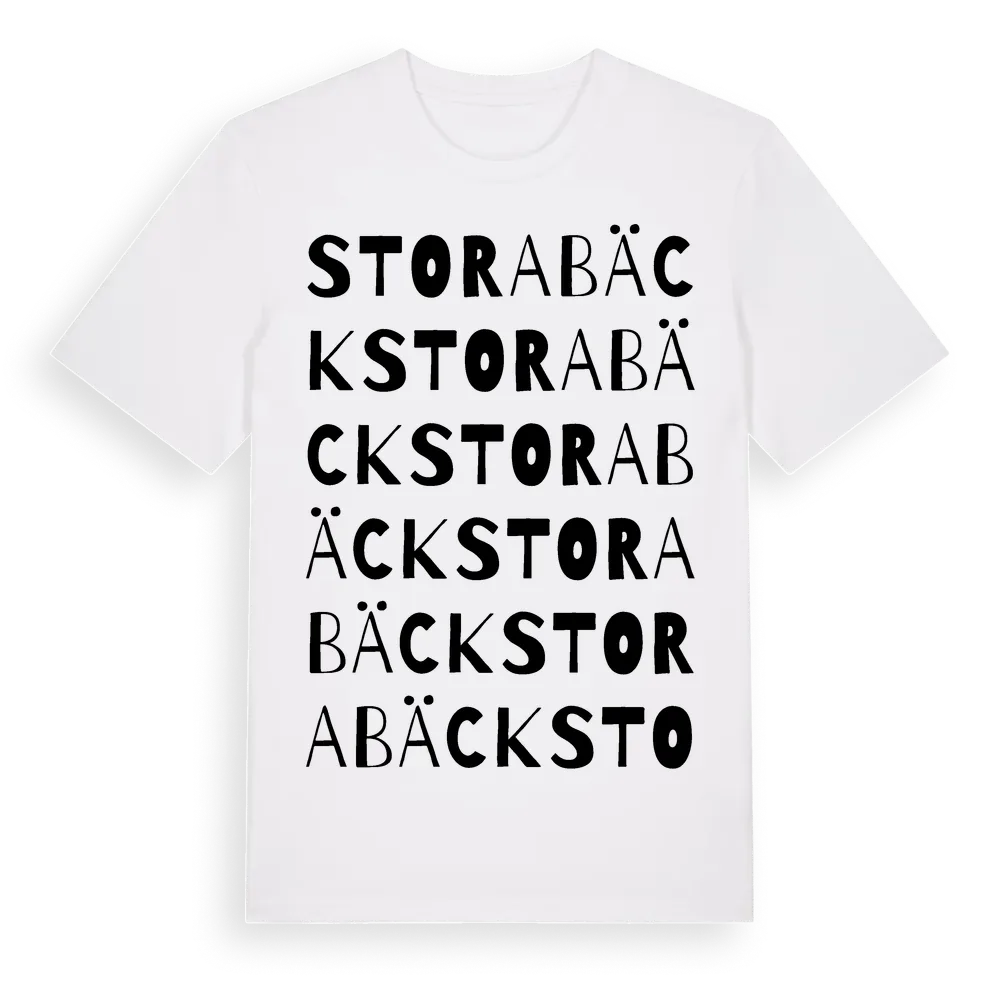 Stora Bäck ordlek t-shirt är inspirerad av Stora Bäck i Hallands län, Sverige. Tröjan är designad för dig som har en speciell koppling till platsen – oavsett om du bor här, har rötterna här eller bara älskar Stora Bäck.