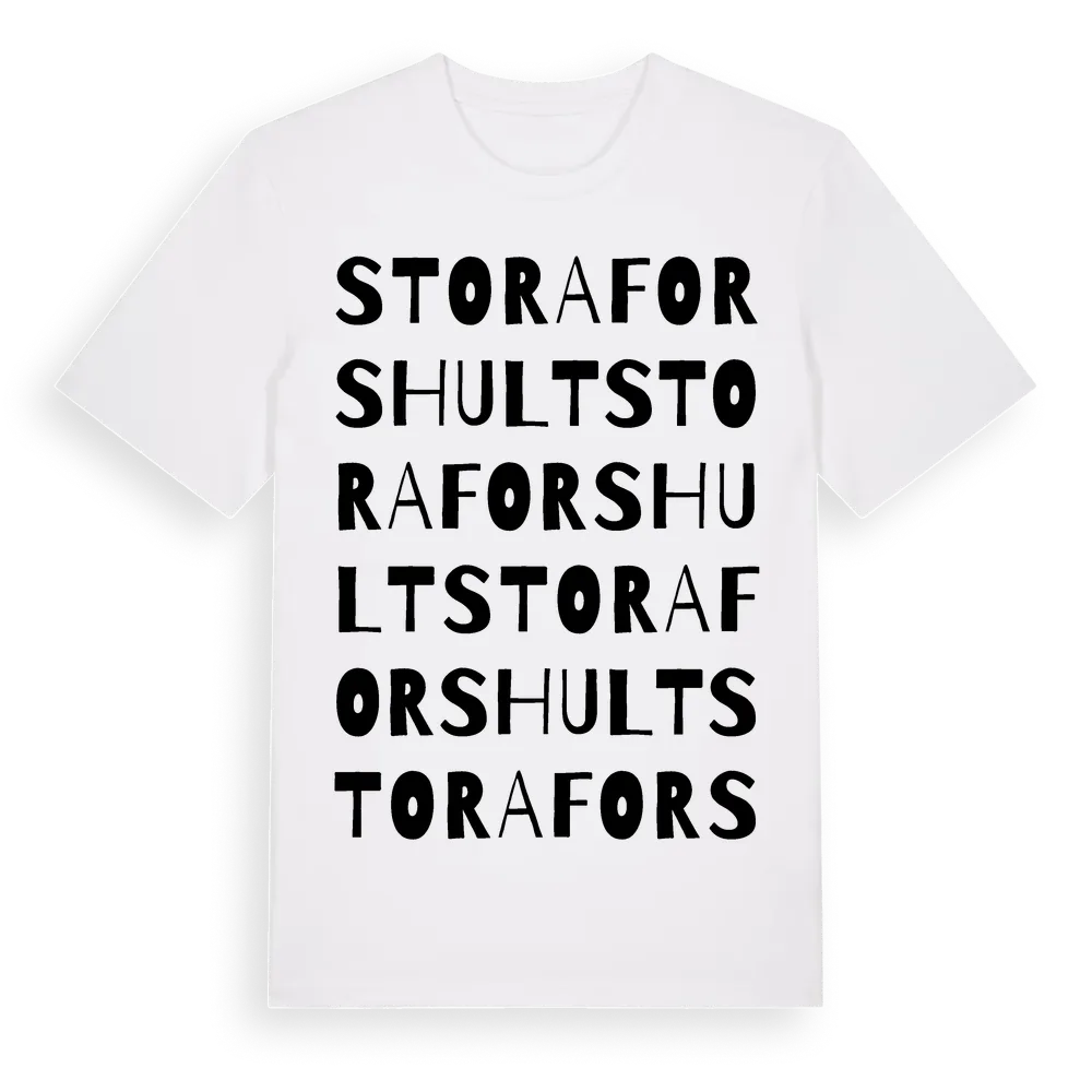 En ordlek byggd på Stora Forshults namn. Subtilt och klurig – ett motiv som bara de som verkligen känner platsen fullt ut förstår. Premium bomull, unisex – från byn Stora Forshult i Hallands län.