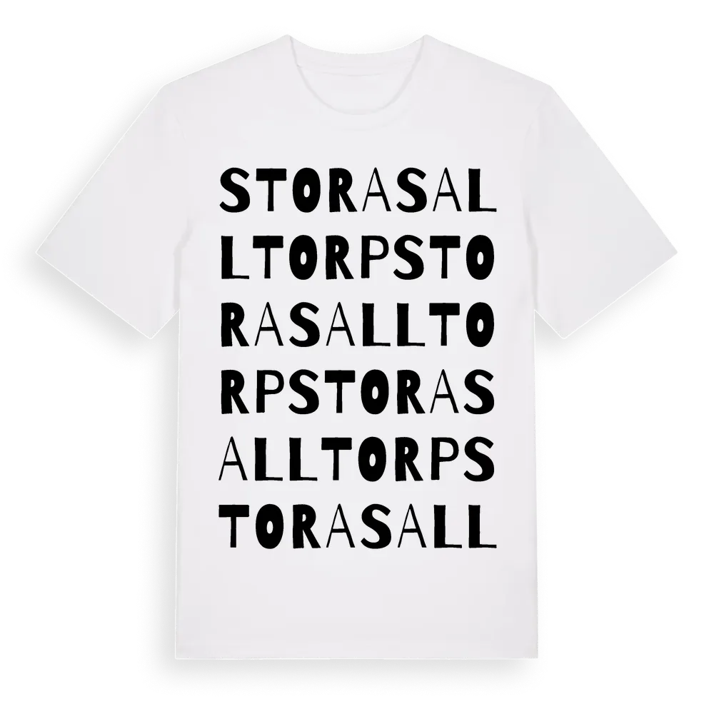 Stora Salltorp ordlek t-shirt är inspirerad av Stora Salltorp i Hallands län, Sverige. Tröjan är designad för dig som har en speciell koppling till platsen – oavsett om du bor här, har rötterna här eller bara älskar Stora Salltorp.