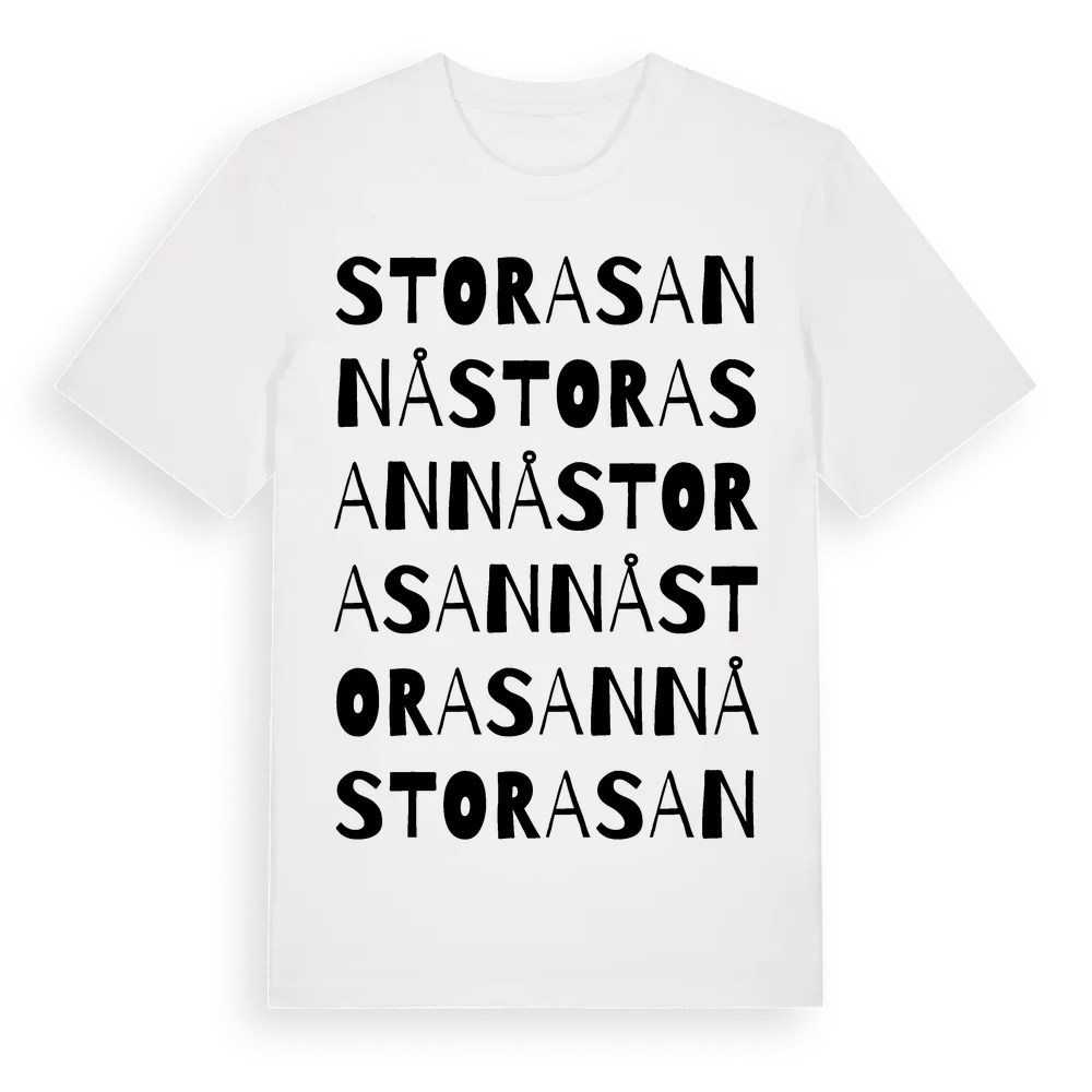 Stora Sannå ordlek t-shirt är inspirerad av Stora Sannå i Hallands län, Sverige. Tröjan är designad för dig som har en speciell koppling till platsen – oavsett om du bor här, har rötterna här eller bara älskar Stora Sannå.