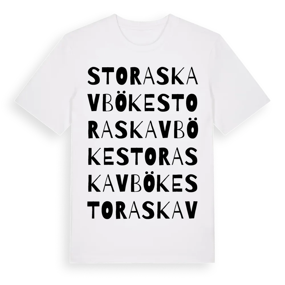 Stora Skavböke ordlek t-shirt är inspirerad av Stora Skavböke i Hallands län, Sverige. Tröjan är designad för dig som har en speciell koppling till platsen – oavsett om du bor här, har rötterna här eller bara älskar Stora Skavböke.