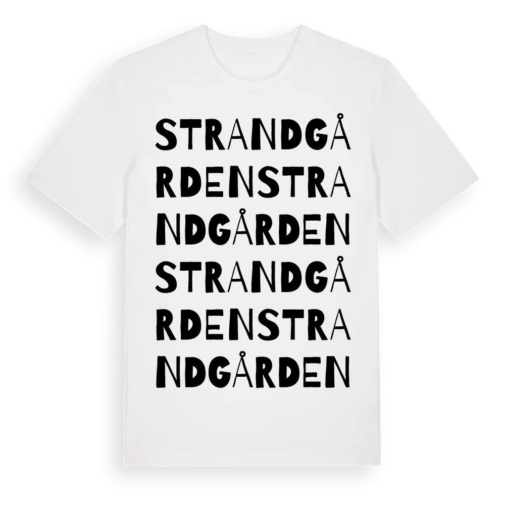 Strandgården ordlek t-shirt är inspirerad av Strandgården i Hallands län, Sverige. Tröjan är designad för dig som har en speciell koppling till platsen – oavsett om du bor här, har rötterna här eller bara älskar Strandgården.