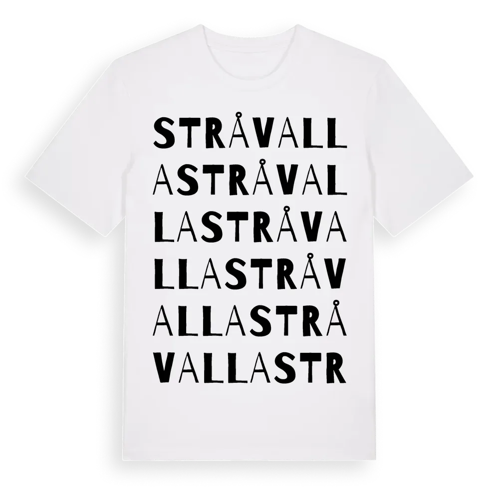 Stråvalla ordlek t-shirt är inspirerad av byn Stråvalla i Hallands län, Sverige. Tröjan är designad för dig som har en speciell koppling till platsen – oavsett om du bor här, har rötterna här eller bara älskar Stråvalla.