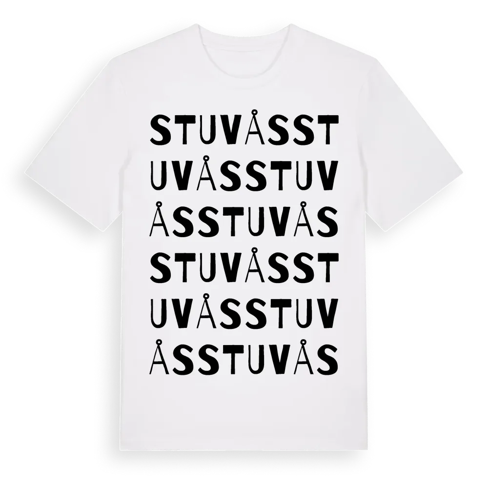 Stuvås ordlek t-shirt är inspirerad av Stuvås i Hallands län, Sverige. Tröjan är designad för dig som har en speciell koppling till platsen – oavsett om du bor här, har rötterna här eller bara älskar Stuvås.
