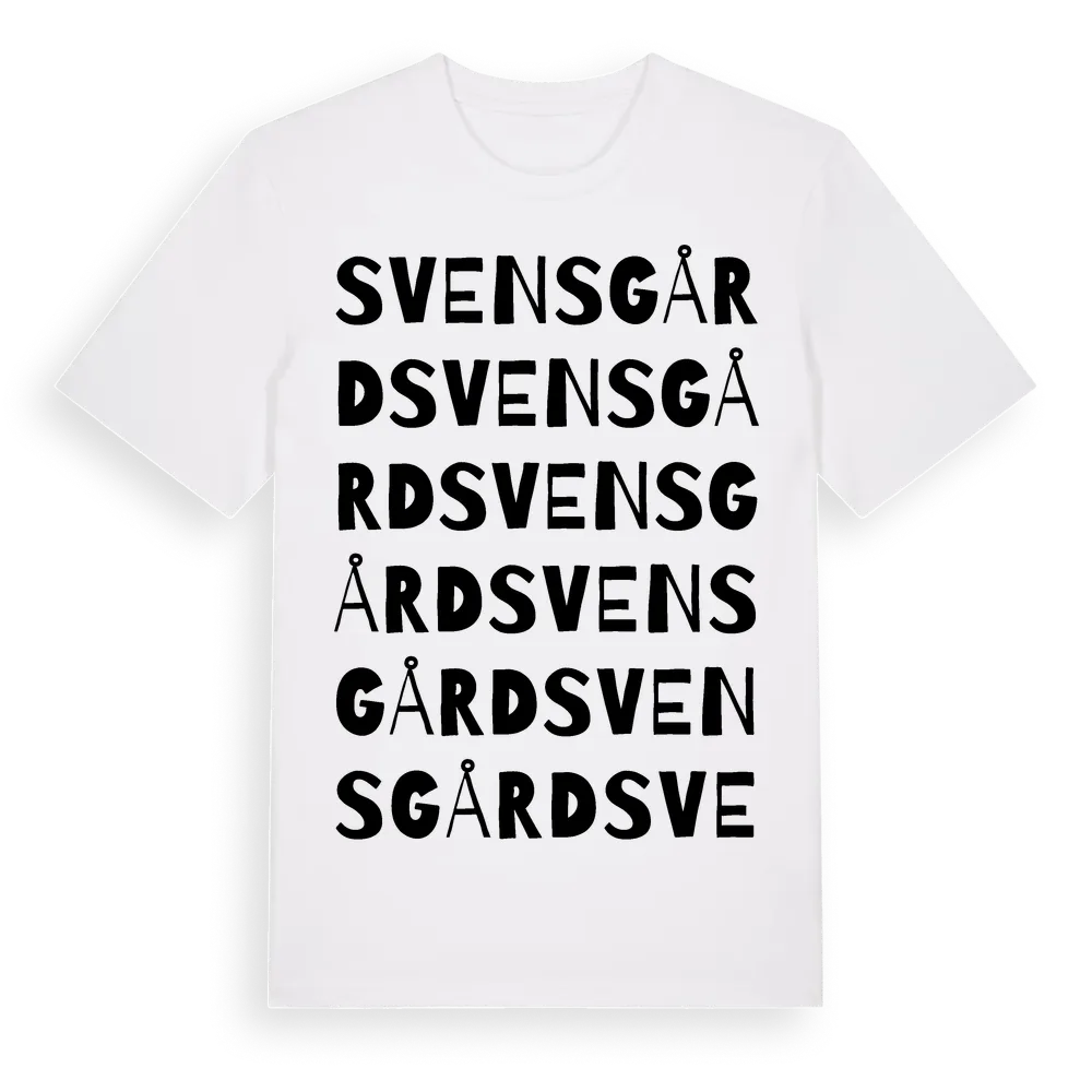 Svensgård ordlek t-shirt är inspirerad av Svensgård i Hallands län, Sverige. Tröjan är designad för dig som har en speciell koppling till platsen – oavsett om du bor här, har rötterna här eller bara älskar Svensgård.