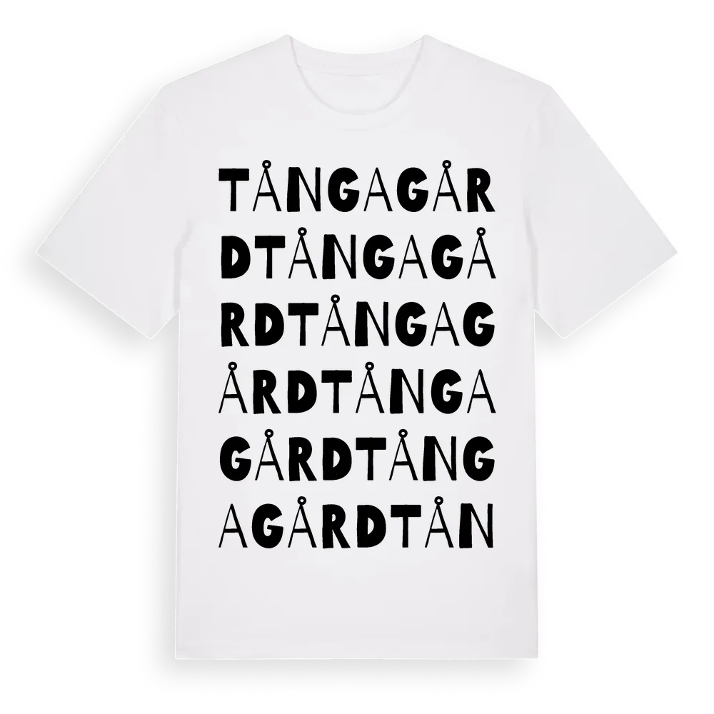 Tångagård ordlek t-shirt är inspirerad av Tångagård i Hallands län, Sverige. Tröjan är designad för dig som har en speciell koppling till platsen – oavsett om du bor här, har rötterna här eller bara älskar Tångagård.