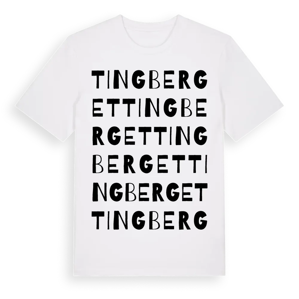 Tingberget ordlek t-shirt är inspirerad av stadsdelen Tingberget i Hallands län, Sverige. Tröjan är designad för dig som har en speciell koppling till platsen – oavsett om du bor här, har rötterna här eller bara älskar Tingberget.