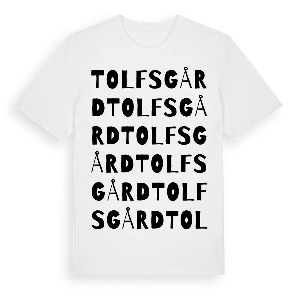 Tolfsgård ordlek t-shirt är inspirerad av Tolfsgård i Hallands län, Sverige. Tröjan är designad för dig som har en speciell koppling till platsen – oavsett om du bor här, har rötterna här eller bara älskar Tolfsgård.