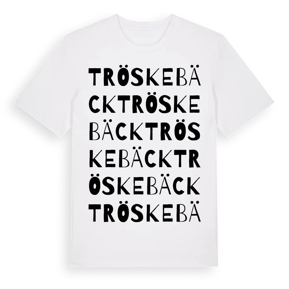 Tröskebäck ordlek t-shirt är inspirerad av Tröskebäck i Hallands län, Sverige. Tröjan är designad för dig som har en speciell koppling till platsen – oavsett om du bor här, har rötterna här eller bara älskar Tröskebäck.