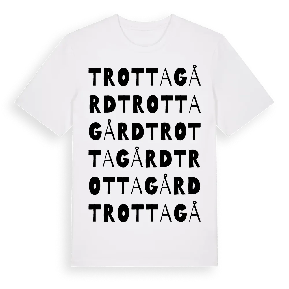 Trottagård ordlek t-shirt är inspirerad av Trottagård i Hallands län, Sverige. Tröjan är designad för dig som har en speciell koppling till platsen – oavsett om du bor här, har rötterna här eller bara älskar Trottagård.