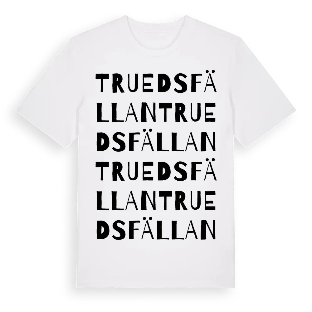Truedsfällan ordlek t-shirt är inspirerad av Truedsfällan i Hallands län, Sverige. Tröjan är designad för dig som har en speciell koppling till platsen – oavsett om du bor här, har rötterna här eller bara älskar Truedsfällan.