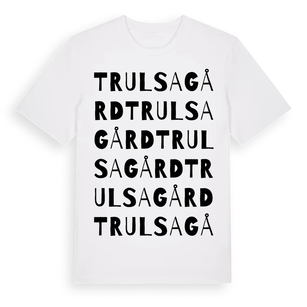 Trulsagård ordlek t-shirt är inspirerad av Trulsagård i Hallands län, Sverige. Tröjan är designad för dig som har en speciell koppling till platsen – oavsett om du bor här, har rötterna här eller bara älskar Trulsagård.