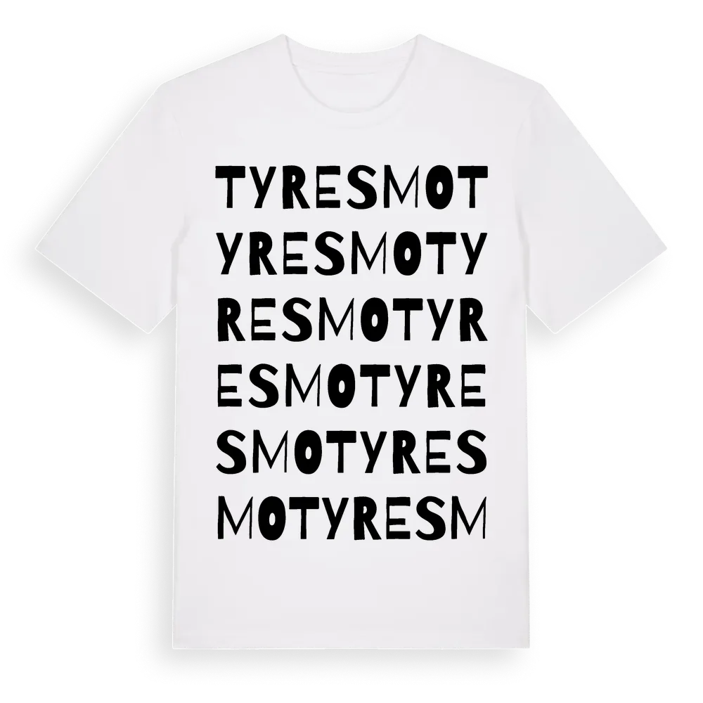 En ordlek byggd på Tyresmos namn. Subtilt och klurig – ett motiv som bara de som verkligen känner platsen fullt ut förstår. Premium bomull, unisex – från Tyresmo i Hallands län.