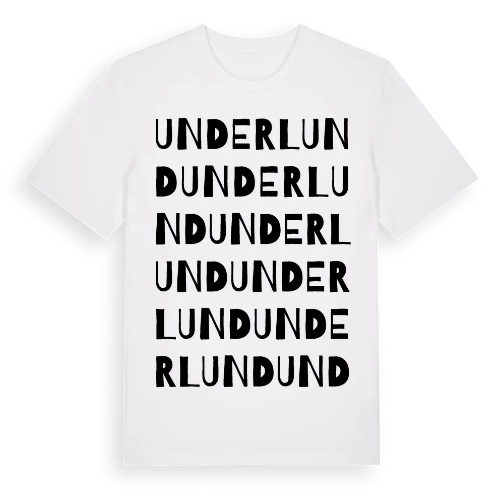 Underlund ordlek t-shirt är inspirerad av byn Underlund i Hallands län, Sverige. Tröjan är designad för dig som har en speciell koppling till platsen – oavsett om du bor här, har rötterna här eller bara älskar Underlund.