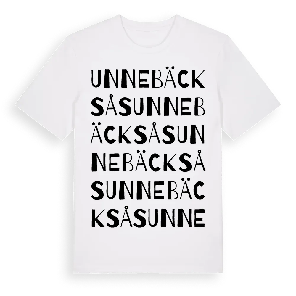 Unnebäcksås ordlek t-shirt är inspirerad av Unnebäcksås i Hallands län, Sverige. Tröjan är designad för dig som har en speciell koppling till platsen – oavsett om du bor här, har rötterna här eller bara älskar Unnebäcksås.