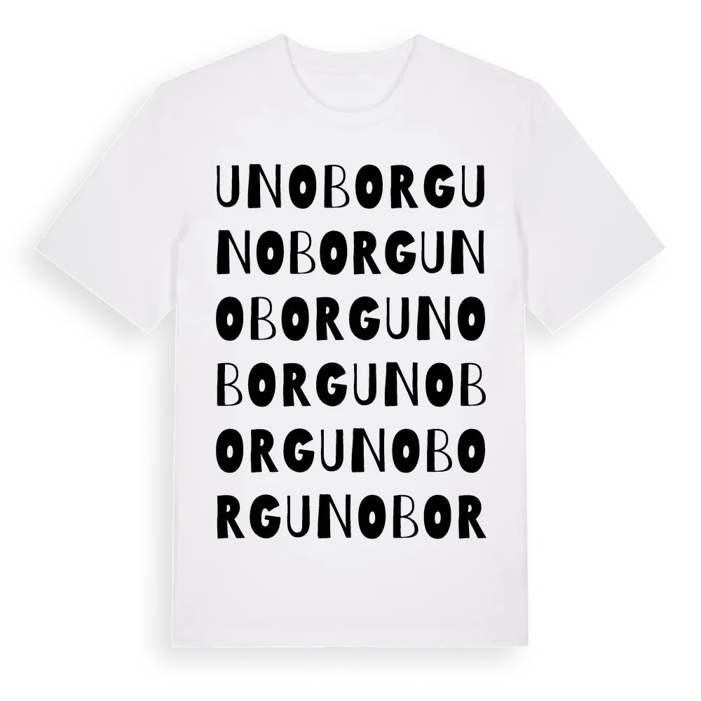 Unoborg ordlek t-shirt är inspirerad av Unoborg i Hallands län, Sverige. Tröjan är designad för dig som har en speciell koppling till platsen – oavsett om du bor här, har rötterna här eller bara älskar Unoborg.