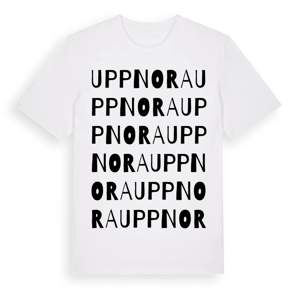 Uppnora ordlek t-shirt är inspirerad av byn Uppnora i Hallands län, Sverige. Tröjan är designad för dig som har en speciell koppling till platsen – oavsett om du bor här, har rötterna här eller bara älskar Uppnora.