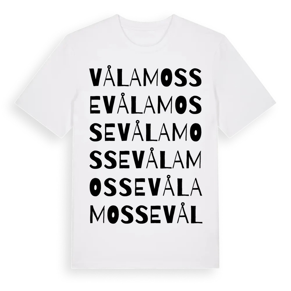 Vålamosse ordlek t-shirt är inspirerad av Vålamosse i Hallands län, Sverige. Tröjan är designad för dig som har en speciell koppling till platsen – oavsett om du bor här, har rötterna här eller bara älskar Vålamosse.