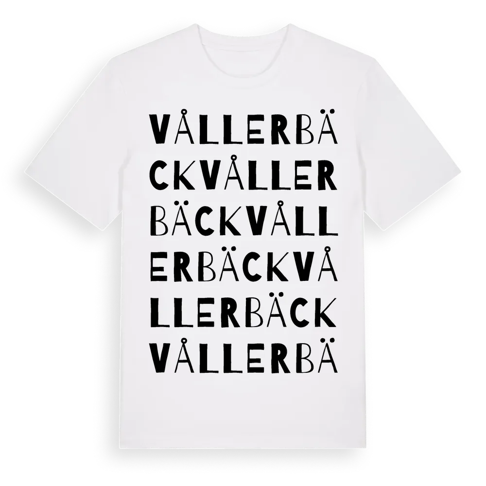 Vållerbäck ordlek t-shirt är inspirerad av Vållerbäck i Hallands län, Sverige. Tröjan är designad för dig som har en speciell koppling till platsen – oavsett om du bor här, har rötterna här eller bara älskar Vållerbäck.
