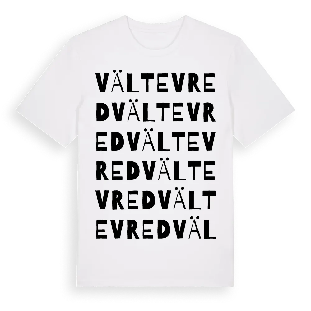 Vältevred ordlek t-shirt är inspirerad av Vältevred i Hallands län, Sverige. Tröjan är designad för dig som har en speciell koppling till platsen – oavsett om du bor här, har rötterna här eller bara älskar Vältevred.