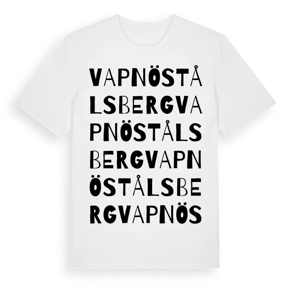 Vapnö Stålsberg ordlek t-shirt är inspirerad av Vapnö Stålsberg i Hallands län, Sverige. Tröjan är designad för dig som har en speciell koppling till platsen – oavsett om du bor här, har rötterna här eller bara älskar Vapnö Stålsberg.
