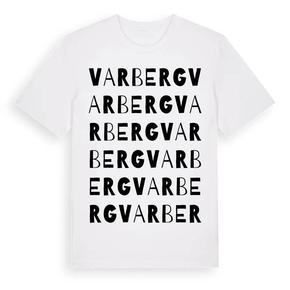 Varberg ordlek t-shirt är inspirerad av staden Varberg i Hallands län, Sverige. Tröjan är designad för dig som har en speciell koppling till platsen – oavsett om du bor här, har rötterna här eller bara älskar Varberg.