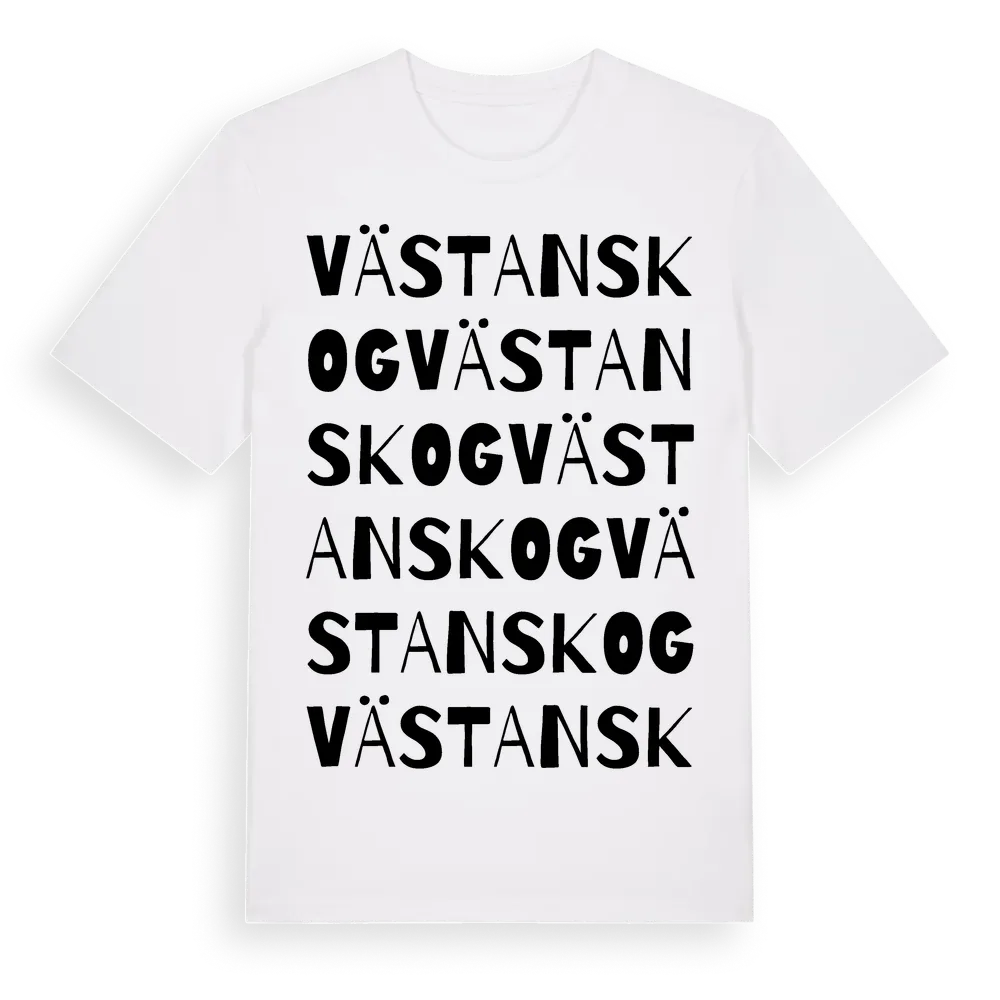 Västanskog ordlek t-shirt är inspirerad av Västanskog i Hallands län, Sverige. Tröjan är designad för dig som har en speciell koppling till platsen – oavsett om du bor här, har rötterna här eller bara älskar Västanskog.