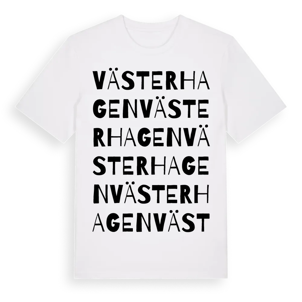 Västerhagen ordlek t-shirt är inspirerad av Västerhagen i Hallands län, Sverige. Tröjan är designad för dig som har en speciell koppling till platsen – oavsett om du bor här, har rötterna här eller bara älskar Västerhagen.