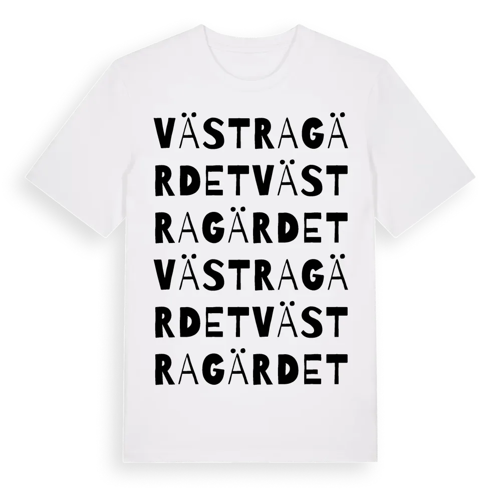 Västra Gärdet ordlek t-shirt är inspirerad av stadsdelen Västra Gärdet i Hallands län, Sverige. Tröjan är designad för dig som har en speciell koppling till platsen – oavsett om du bor här, har rötterna här eller bara älskar Västra Gärdet.