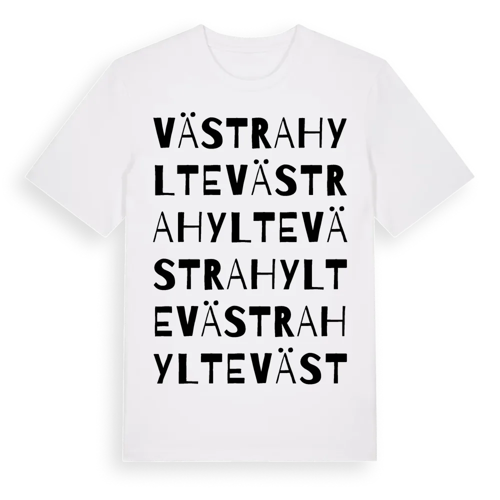 Västra Hylte ordlek t-shirt är inspirerad av Västra Hylte i Hallands län, Sverige. Tröjan är designad för dig som har en speciell koppling till platsen – oavsett om du bor här, har rötterna här eller bara älskar Västra Hylte.