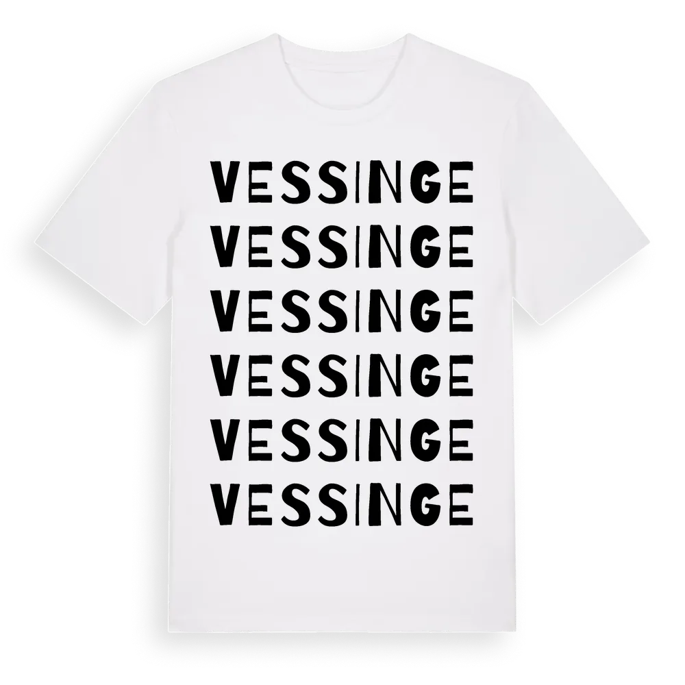 Vessinge ordlek t-shirt är inspirerad av byn Vessinge i Hallands län, Sverige. Tröjan är designad för dig som har en speciell koppling till platsen – oavsett om du bor här, har rötterna här eller bara älskar Vessinge.