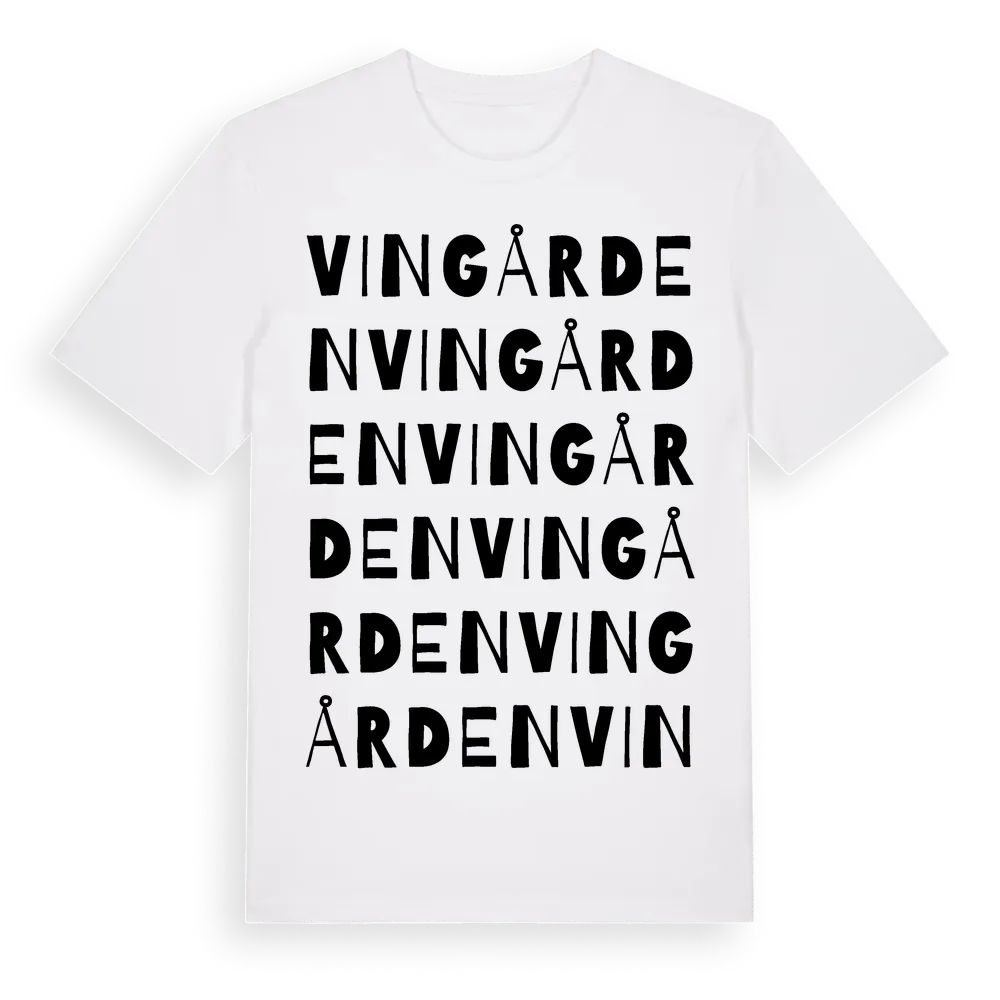 Vingården ordlek t-shirt är inspirerad av Vingården i Hallands län, Sverige. Tröjan är designad för dig som har en speciell koppling till platsen – oavsett om du bor här, har rötterna här eller bara älskar Vingården.