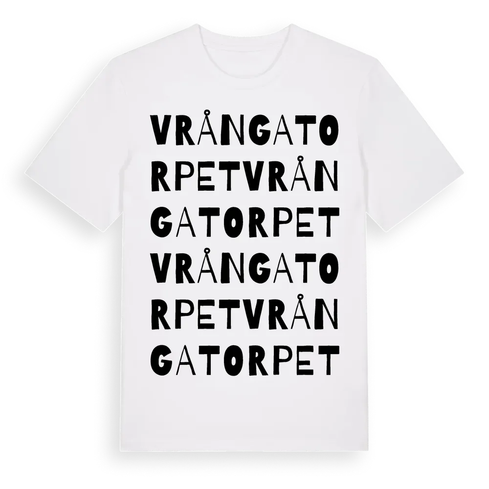 Vrångatorpet ordlek t-shirt är inspirerad av Vrångatorpet i Hallands län, Sverige. Tröjan är designad för dig som har en speciell koppling till platsen – oavsett om du bor här, har rötterna här eller bara älskar Vrångatorpet.