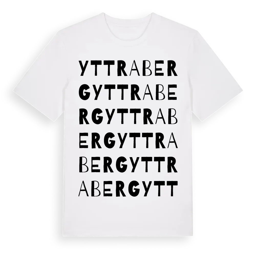 Yttra Berg ordlek t-shirt är inspirerad av Yttra Berg i Hallands län, Sverige. Tröjan är designad för dig som har en speciell koppling till platsen – oavsett om du bor här, har rötterna här eller bara älskar Yttra Berg.