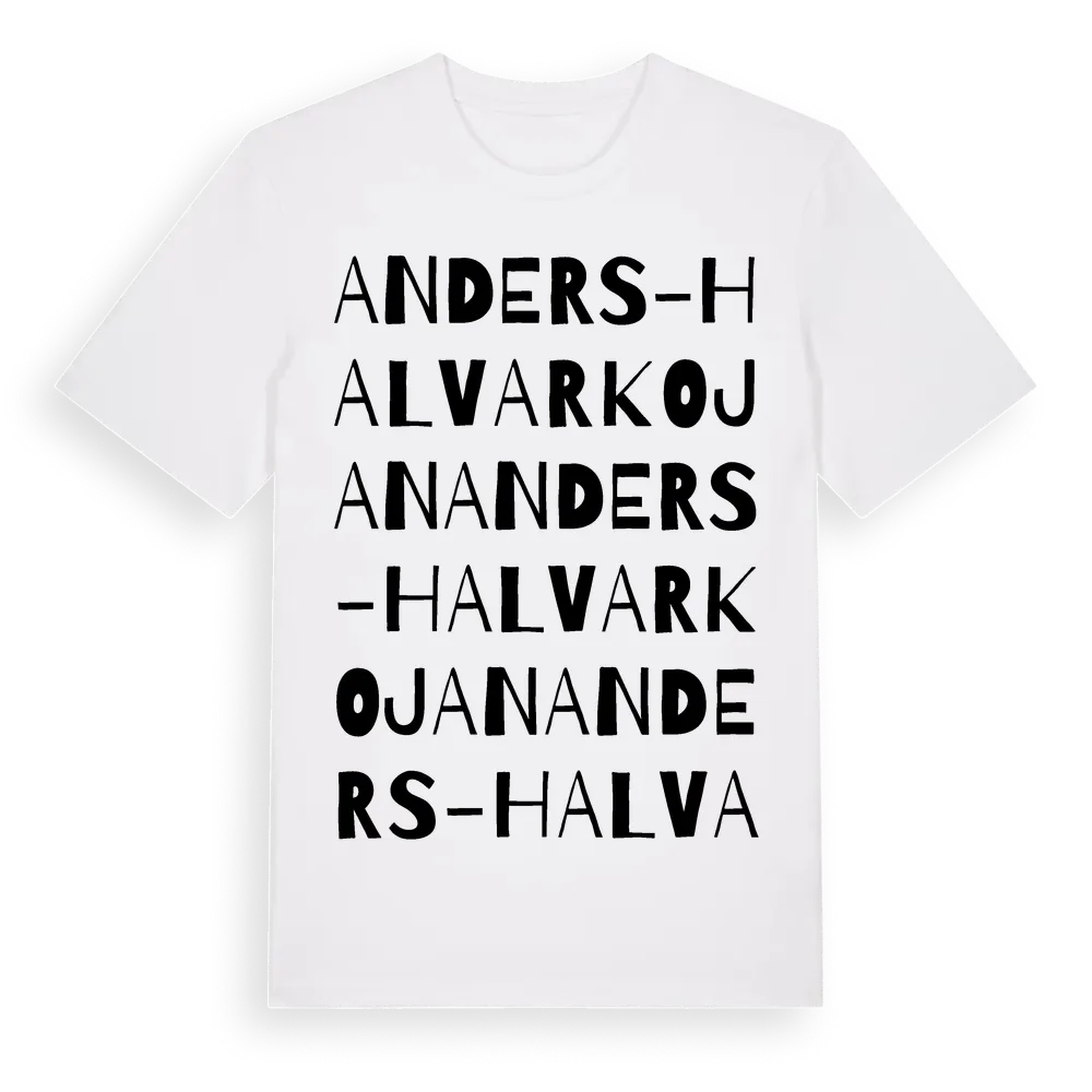 Anders-Halvarkojan ordlek t-shirt är inspirerad av Anders-Halvarkojan i Jämtlands län, Sverige. Tröjan är designad för dig som har en speciell koppling till platsen – oavsett om du bor här, har rötterna här eller bara älskar Anders-Halvarkojan.