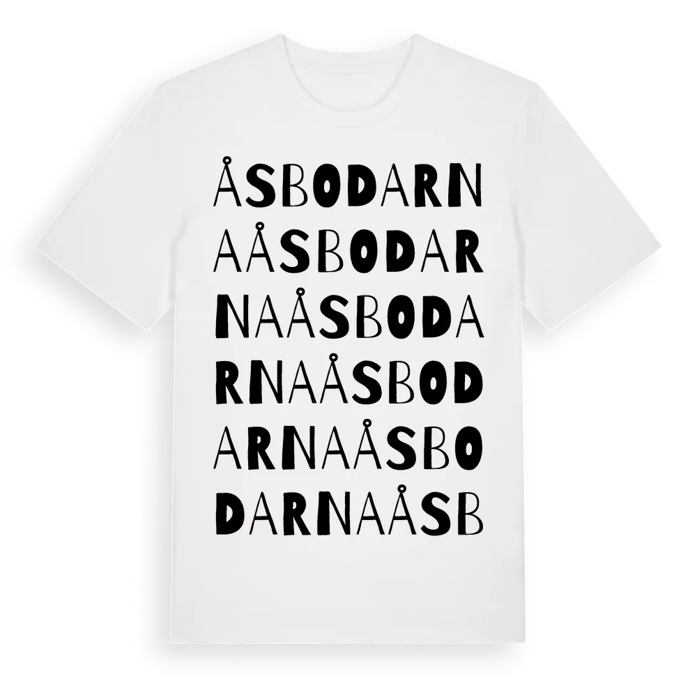 Åsbodarna ordlek t-shirt är inspirerad av Åsbodarna i Jämtlands län, Sverige. Tröjan är designad för dig som har en speciell koppling till platsen – oavsett om du bor här, har rötterna här eller bara älskar Åsbodarna.