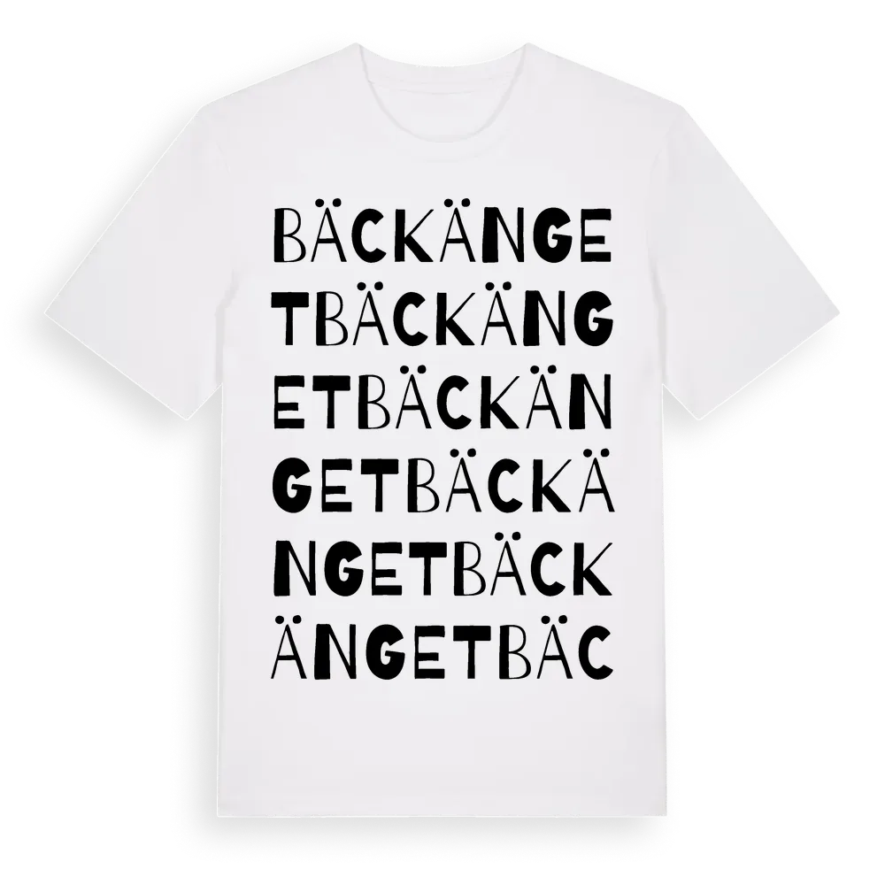 Bäckänget ordlek t-shirt är inspirerad av Bäckänget i Jämtlands län, Sverige. Tröjan är designad för dig som har en speciell koppling till platsen – oavsett om du bor här, har rötterna här eller bara älskar Bäckänget.