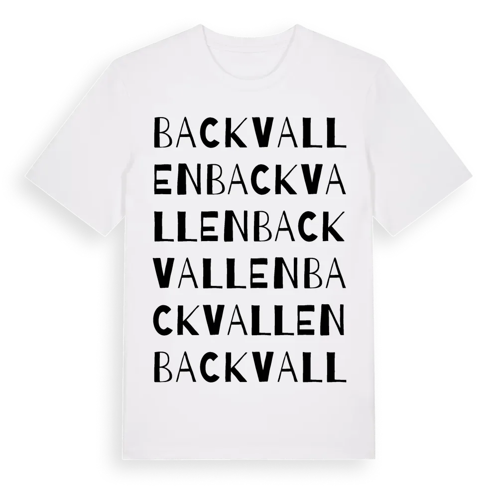 Backvallen ordlek t-shirt är inspirerad av Backvallen i Jämtlands län, Sverige. Tröjan är designad för dig som har en speciell koppling till platsen – oavsett om du bor här, har rötterna här eller bara älskar Backvallen.