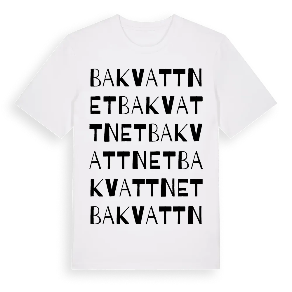 Bakvattnet ordlek t-shirt är inspirerad av byn Bakvattnet i Jämtlands län, Sverige. Tröjan är designad för dig som har en speciell koppling till platsen – oavsett om du bor här, har rötterna här eller bara älskar Bakvattnet.