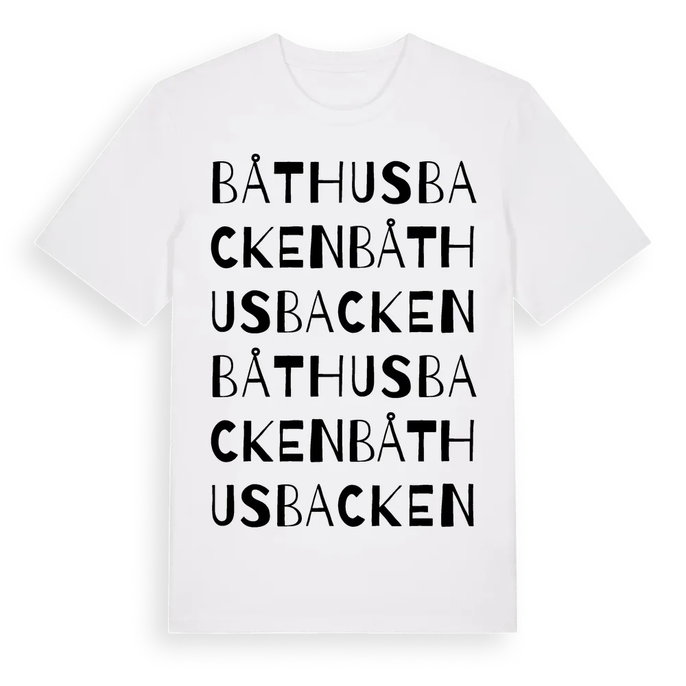 Båthusbacken ordlek t-shirt är inspirerad av Båthusbacken i Jämtlands län, Sverige. Tröjan är designad för dig som har en speciell koppling till platsen – oavsett om du bor här, har rötterna här eller bara älskar Båthusbacken.