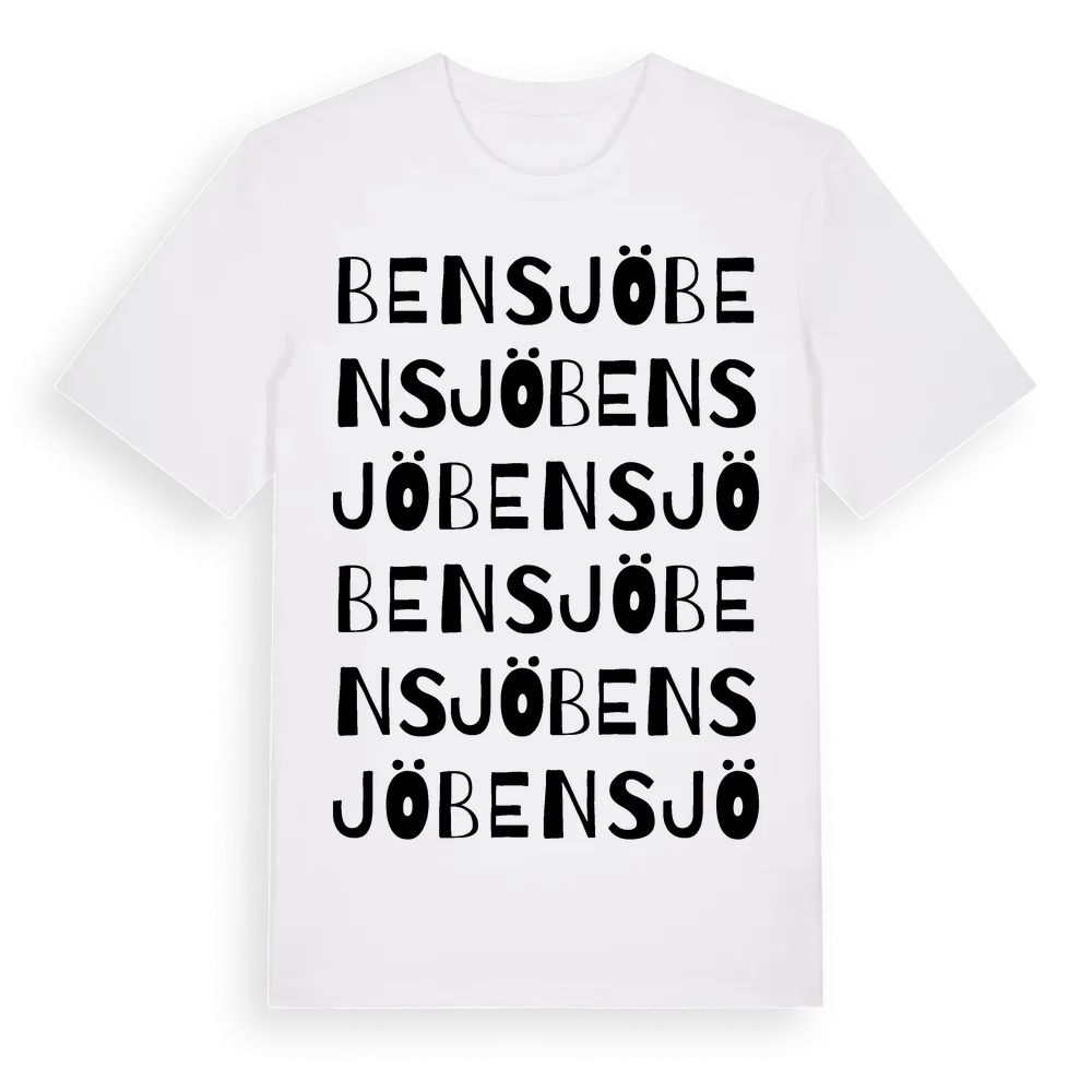Bensjö ordlek t-shirt är inspirerad av byn Bensjö i Jämtlands län, Sverige. Tröjan är designad för dig som har en speciell koppling till platsen – oavsett om du bor här, har rötterna här eller bara älskar Bensjö.