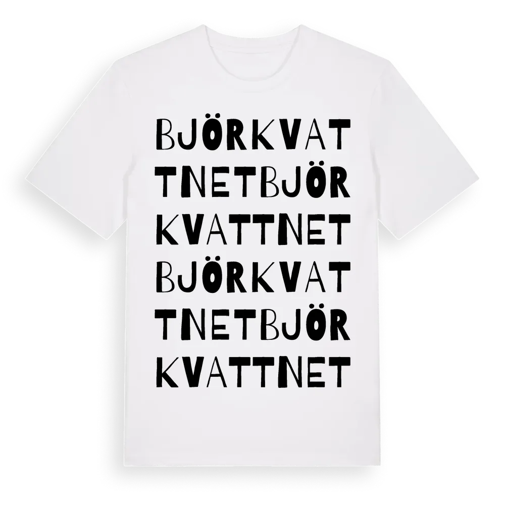 Björkvattnet ordlek t-shirt är inspirerad av Björkvattnet i Jämtlands län, Sverige. Tröjan är designad för dig som har en speciell koppling till platsen – oavsett om du bor här, har rötterna här eller bara älskar Björkvattnet.
